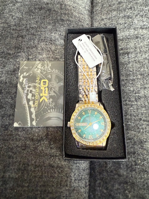 Men's watch inspected with quality certification. Retail for $59.00. Beautiful green faceplate with gold and silver bands.